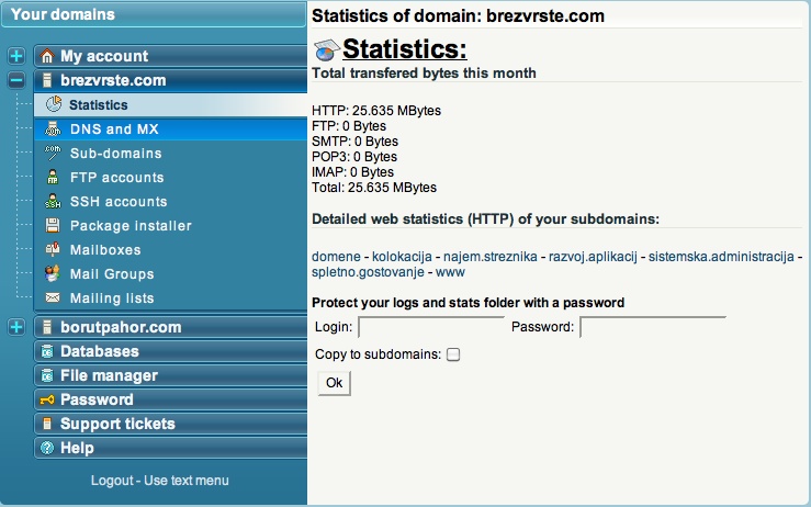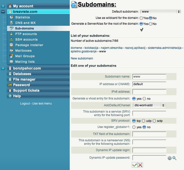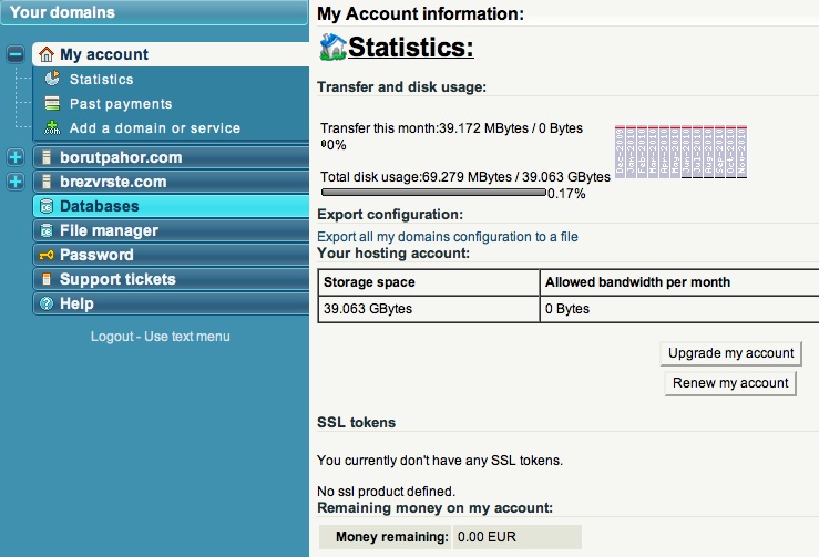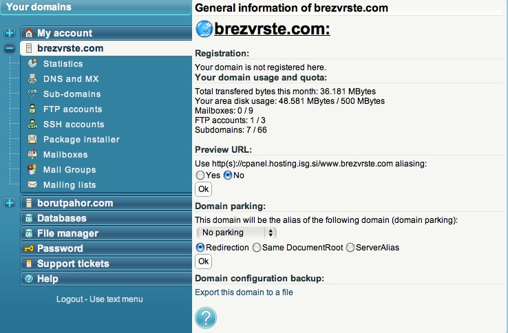Za lažjo administracijo MySql baze podatkov je nameščen PHPMyAdmin. Z ostalimi sredstvi se upravlja preko upravljalske plošče. Seznam vseh možnosti je preprosto preobsežen, da bi ga tu navedli. Spodnje slike prikazujejo nekatere možnosti. Nove možnosti se neprestano dodajajo.